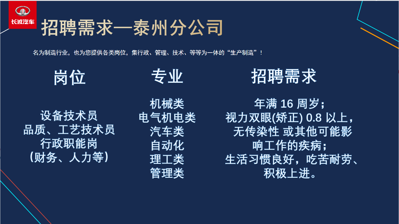 长城汽车泰州分公司2022届校园招聘