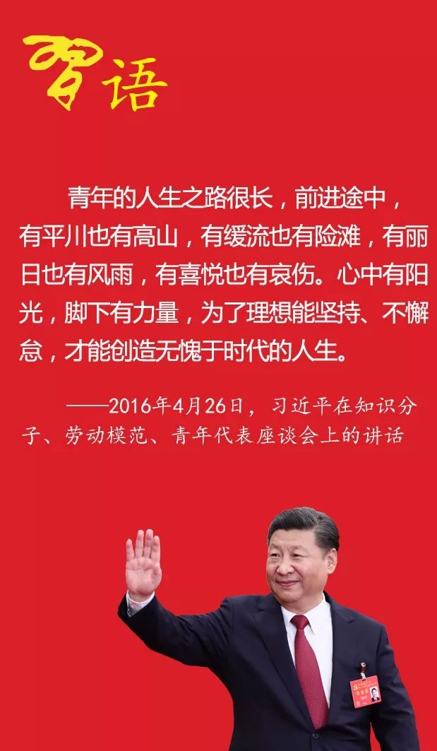 青年的人生之路很长,前进途中,有平川也有高山,有缓流也有险滩,有丽日也有风雨,有喜悦也有哀伤。 心中有阳光,脚下有力量,为了理想能坚持、不懈怠,才能创造无愧于时代的人生。