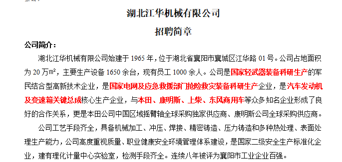 湖北江华机械有限公司招聘简章